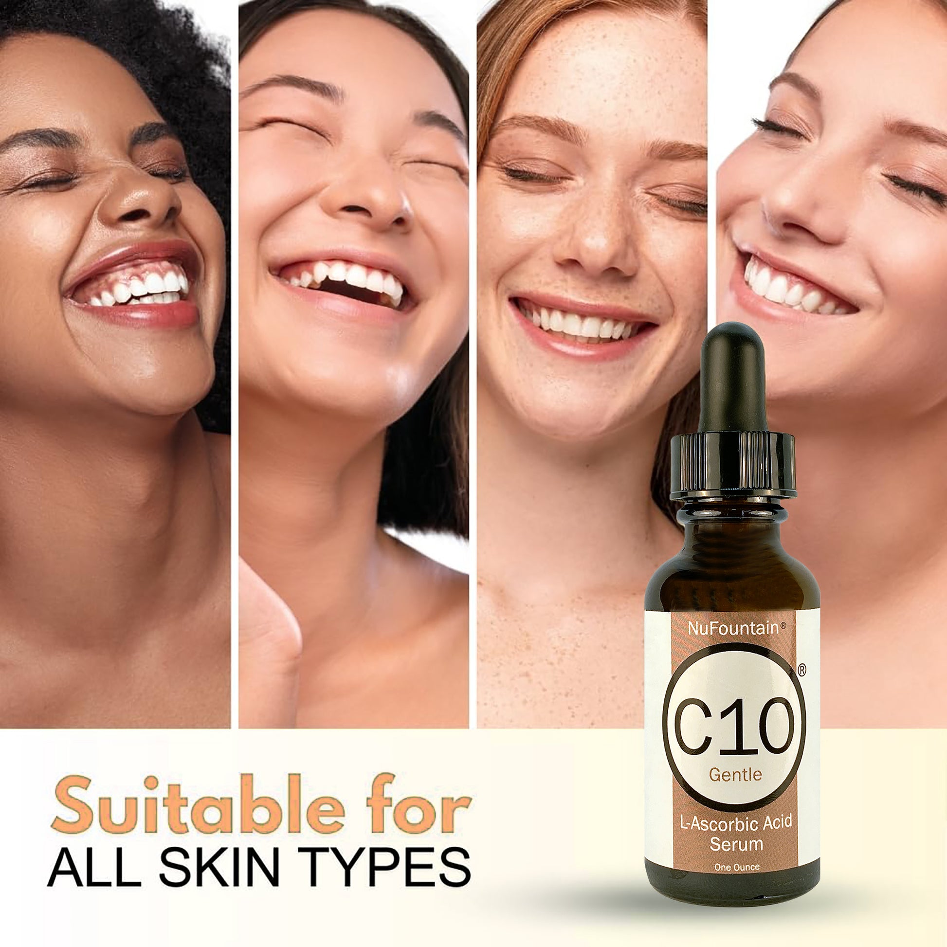 - DAILY APPLICATION: Daily application of NuFountain C10 vitamin C serum improves texture, fine lines, and wrinkles and promotes a supple, resilient, youthful, and glowing complexion. For all skin types. Specially formulated, fragrance-free & oil-free for resilient, acne-prone skin types. Manufactured using only the freshest, highest-quality ingredients.