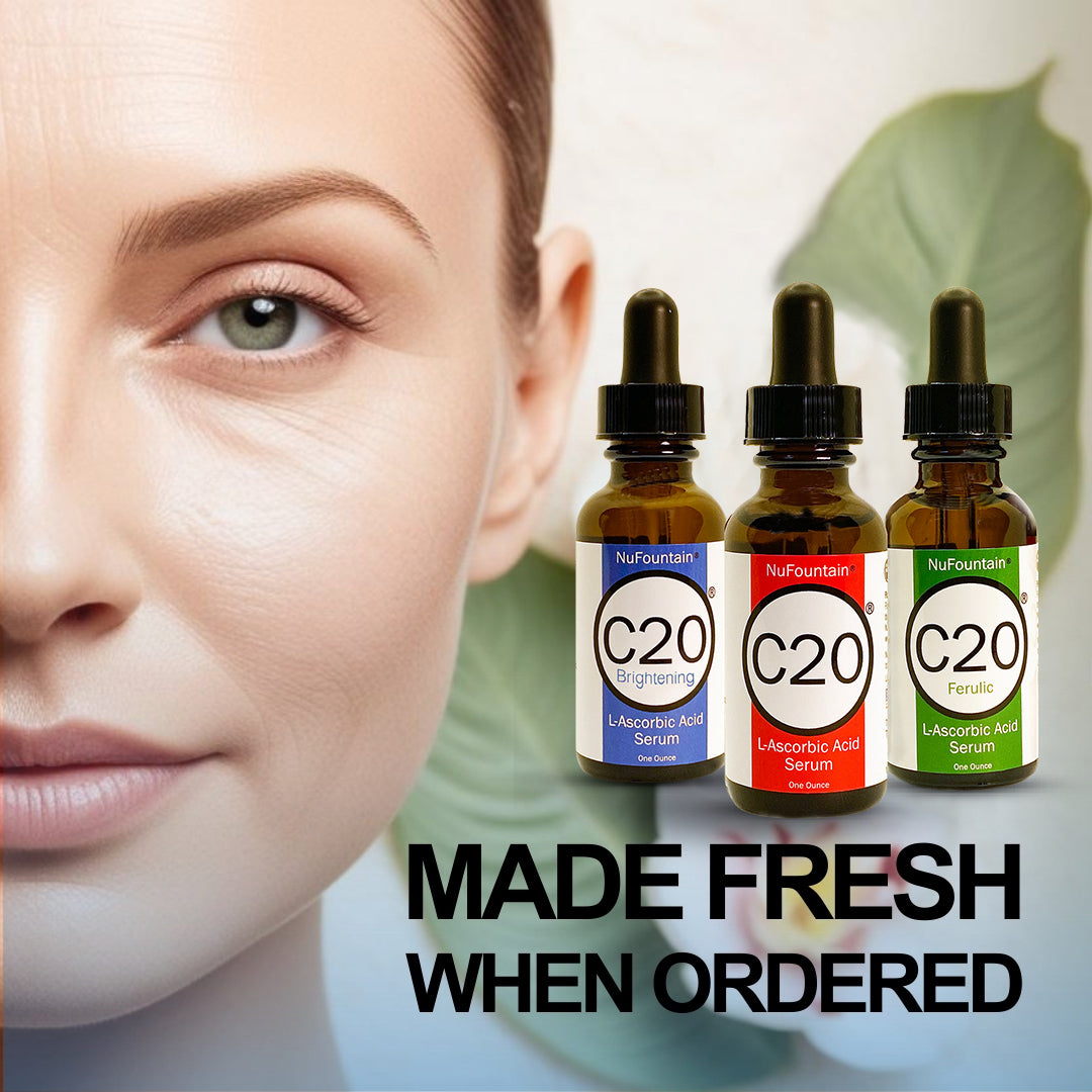 - FRESHLY MADE FOR MAXIMUM POTENCY: Unlike pre-made serums that degrade over time, NuFountain C20 is freshly made when ordered, ensuring maximum effectiveness. This pure Vitamin C serum delivers 20% L-ascorbic acid, a clinically proven ingredient that helps reduce signs of aging and enhances skin repair. Made in the U.S.A. Made Fresh When Ordered with "Date Made" written on bottle—store unopened bottles in the refrigerator.